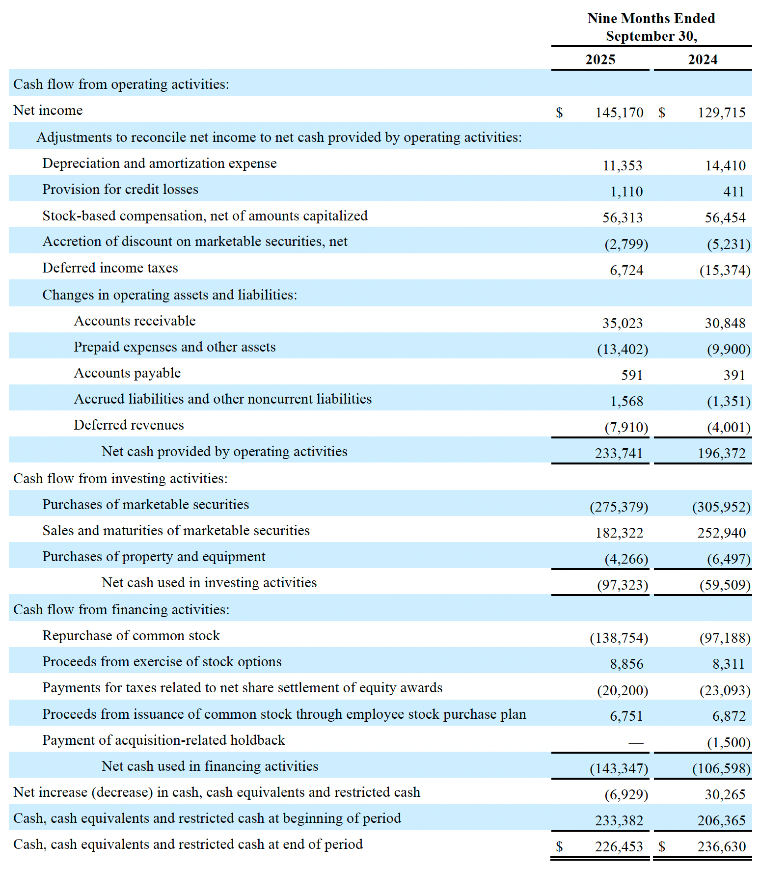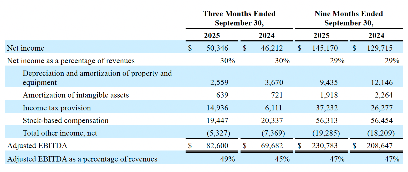 Net Income: GAAP net income for the third quarter of 2025 increased by 9% to $50.3 million, or $1.39 per diluted share, compared to $46.2 million, or $1.24 per diluted share, for the same quarter in 2024. As a percentage of revenues, GAAP net income was 30% for both the third quarter of 2025 and the same quarter in 2024. Non-GAAP net income for the third quarter of 2025 was $67.4 million, or $1.86 per diluted share, compared to $58.0 million, or $1.56 per diluted share, for the same quarter in 2024. As a percentage of revenues, non-GAAP net income was 40% for the third quarter of 2025 compared to 38% for the same quarter in 2024.