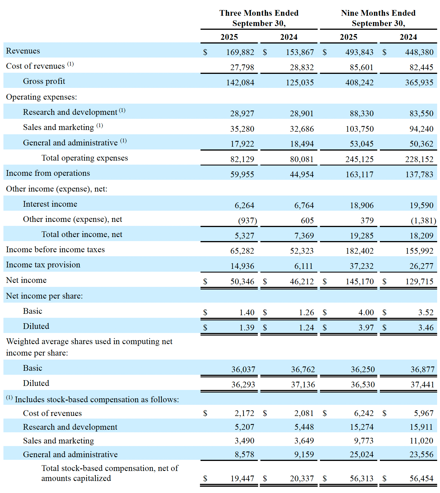 Operating Income: GAAP operating income for the third quarter of 2025 increased by 33% to $60.0 million compared to $45.0 million for the same quarter in 2024. As a percentage of revenues, GAAP operating income was 35% for the third quarter of 2025 compared to 29% for the same quarter in 2024. Non-GAAP operating income for the third quarter of 2025 increased by 21% to $80.0 million compared to $66.0 million for the same quarter in 2024. As a percentage of revenues, non-GAAP operating income was 47% for the third quarter of 2025 compared to 43% for the same quarter in 2024.