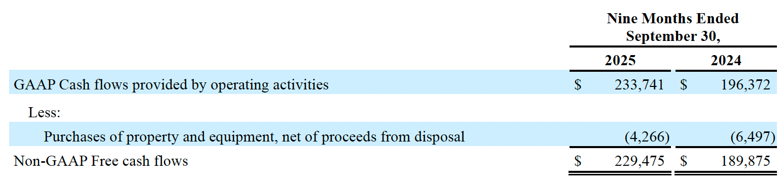 Operating Cash Flow: Operating cash flow for the third quarter of 2025 increased by 48% to $90.4 million compared to $61.0 million for the same quarter in 2024. As a percentage of revenues, operating cash flow was 53% for the third quarter of 2025 compared to 40% for the same quarter in 2024.